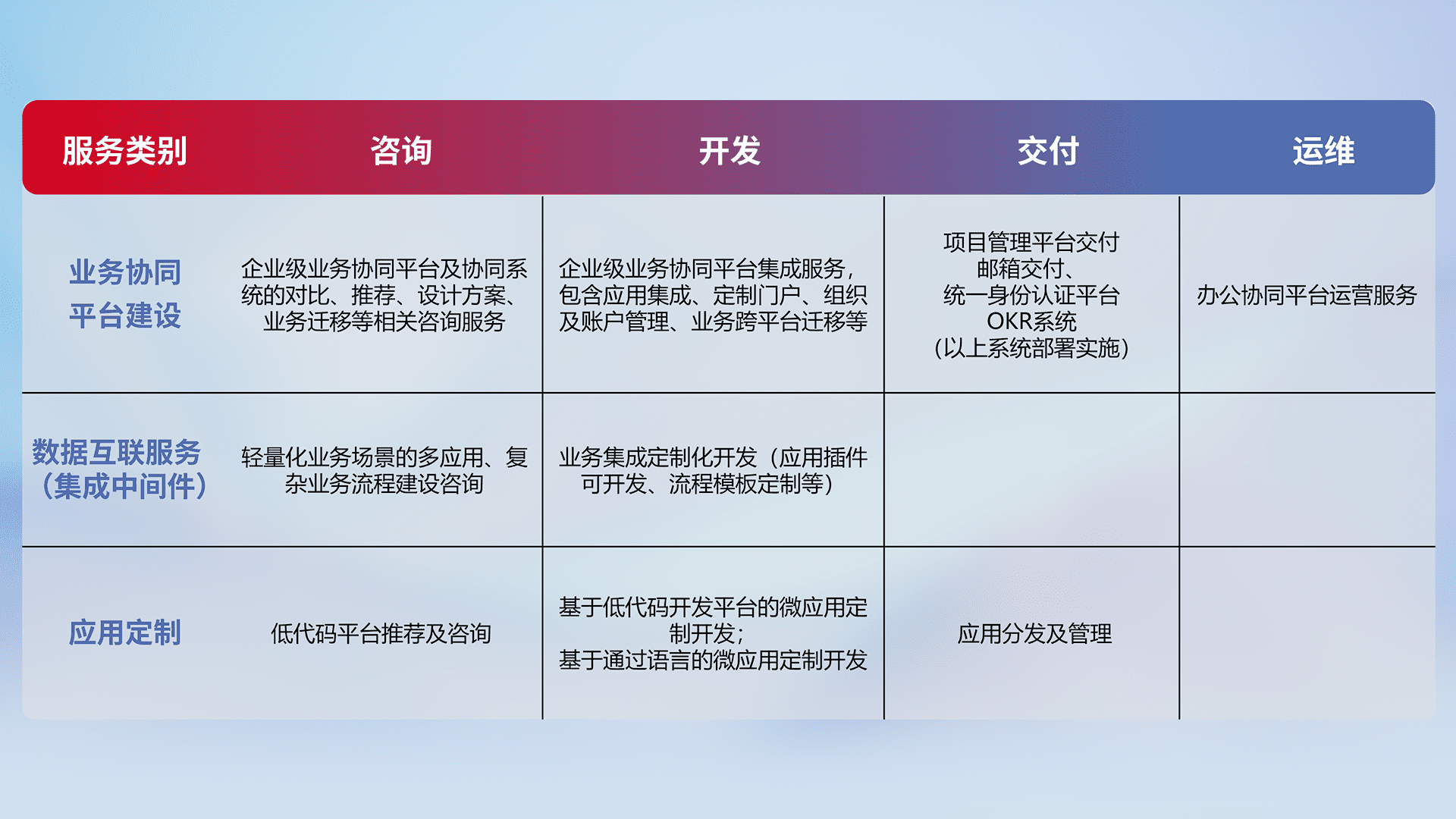 针对钉钉、、、、企微、、、IDaas等平台级产品提供产品的规划、、、、方案、、、交付、、、、定制化开发等服务,,实现如统一协同办公、、、、智能客户服务、、、、混合会议管理、、、智能数据查询、、、等业务场景,,,,实现数字化转型。。。。